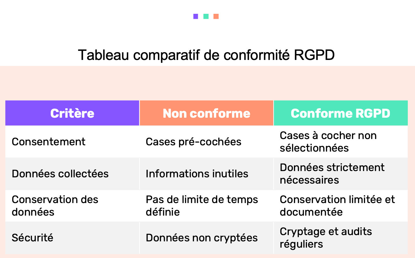 Application pratique : Précisez clairement la base légale dans votre politique de confidentialité et veillez à ce que votre processus de collecte permette d'en conserver la preuve.